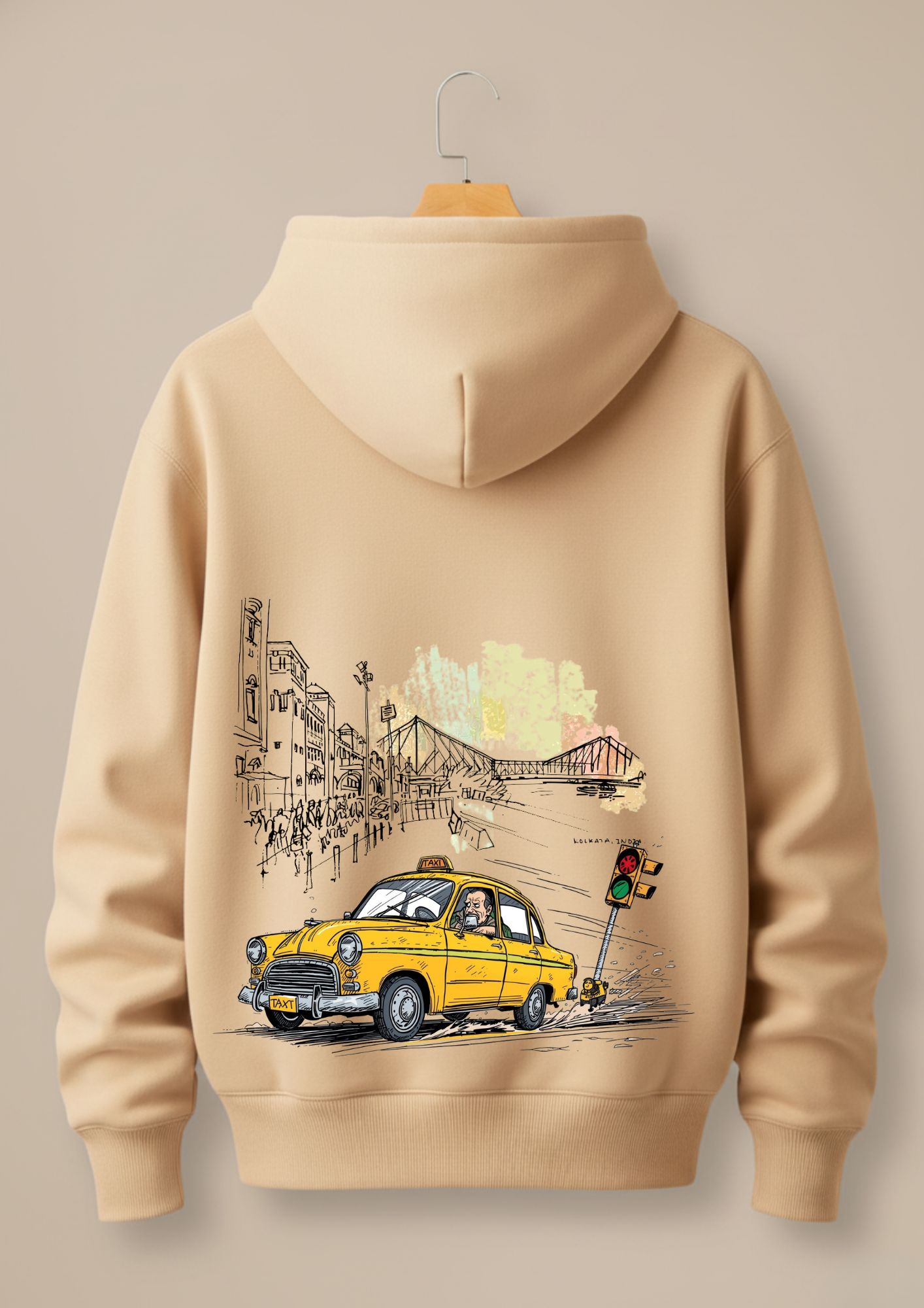 Heritage Street Vibes Edition captures the soul of the city with its iconic yellow cab and Howrah Bridge artwork. Made with 350+ GSM cotton fleece, it offers a smooth, warm, premium feel without any compromise on quality. Delivered exactly as shown in the mockup.