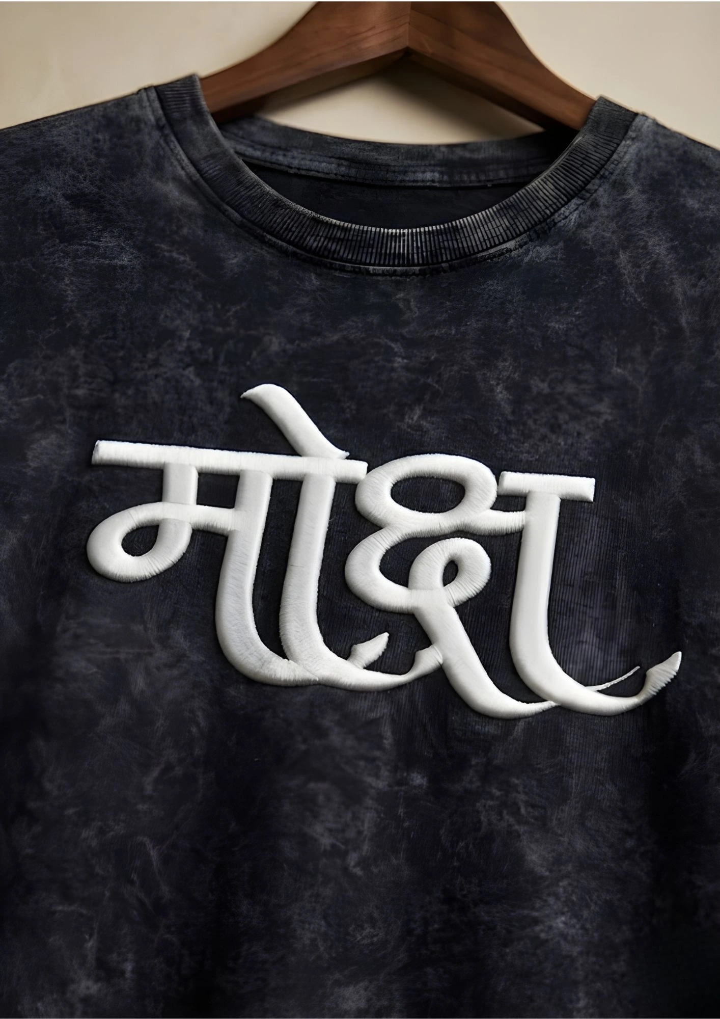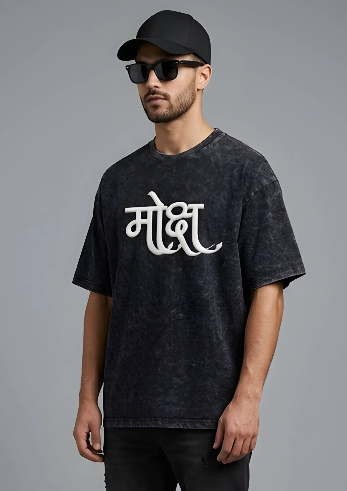 Find your freedom with the Moksha tee — an oversized black acid wash heavyweight 240GSM cotton t-shirt featuring a stunning 3D puff-print Hindi calligraphy graphic. Pre-shrunk, ultra-soft, and crafted for those who carry depth in their style